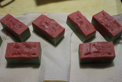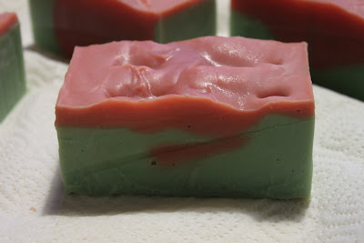 11% Überfettung plus ein Schwupps Öl für die roten und grünen Pigmente von Parfümwolke. Duft ist eine etherische Ölmischung von Primavera, sehr weihnachtlich-würzig. Da ich die Mischung sparsam dosiert habe, duftet sie wirklich wie Lebkuchen.